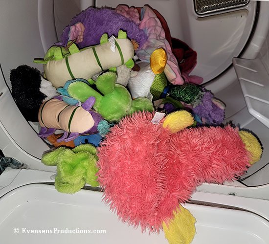 Our pups, especially Baby Lily, tend to take a stuffed toy outside every time they go out. They just don't bring those toys back in. Of course, they get muddy and dirty. So, every few days we walk around, pick them up, and I toss them into the washer with Tide and laundry sanitizer. Above you see a load of toys in the washer. The image was taken through the glass top of the washer.